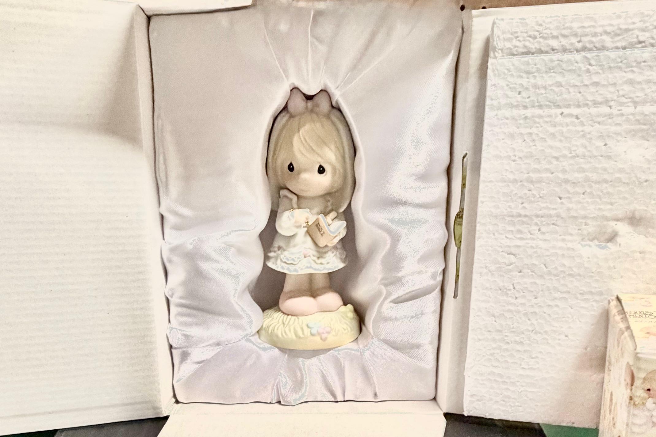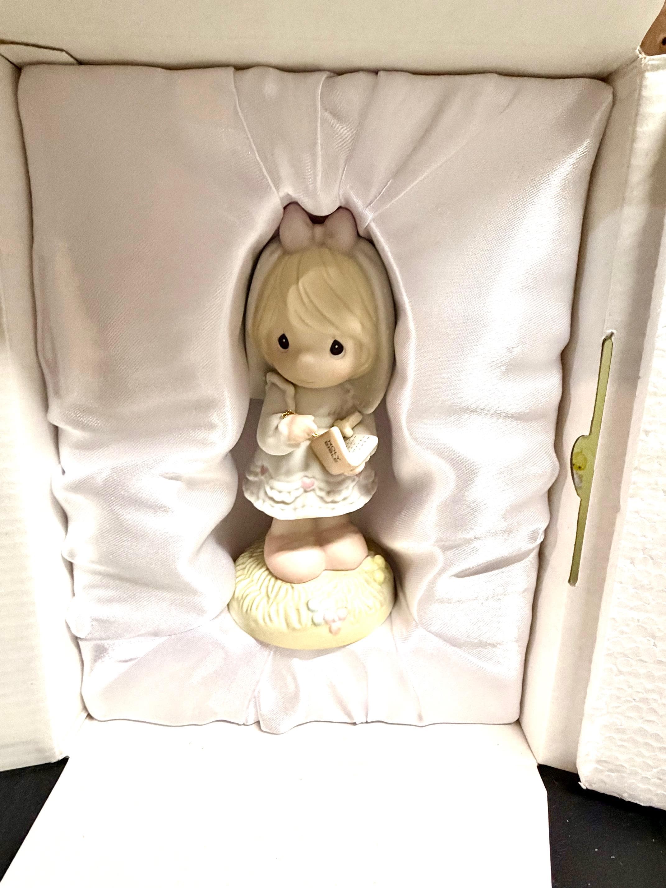 Celebrate a cherished milestone with this beautiful Precious Moments figurine featuring a young girl dressed for her First Holy Communion. Holding her rosary and Bible, she captures the innocence and joy of this blessed day. Crafted in fine bisque porcelain and standing approximately 5.5 inches tall, this collectible makes a heartfelt keepsake for a special young lady or a thoughtful addition to any Precious Moments display.