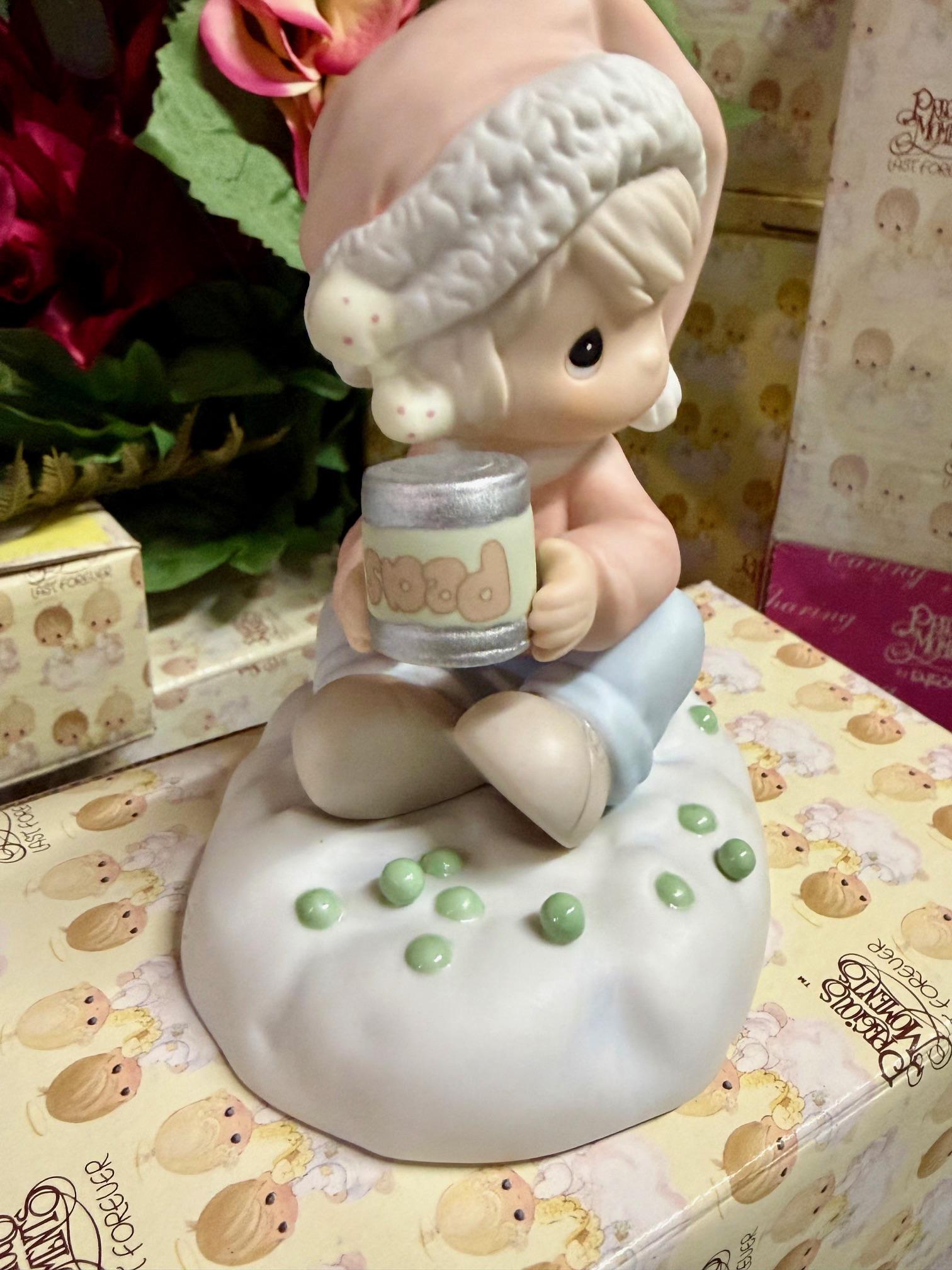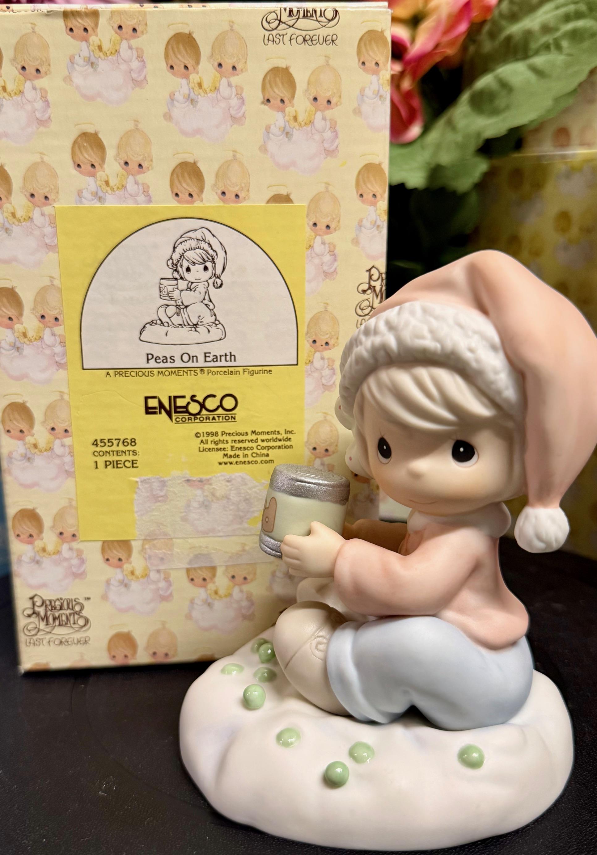 Spread a little holiday cheer with this adorable Precious Moments figurine featuring a sweet child in a Santa hat surrounded by peas. Released in 1998, Peas On Earth brings a playful twist to the classic message of peace and goodwill. Crafted in bisque porcelain with soft pastel details, this collectible is perfect for Christmas displays, gift-giving, or adding a touch of whimsy to your Precious Moments collection.