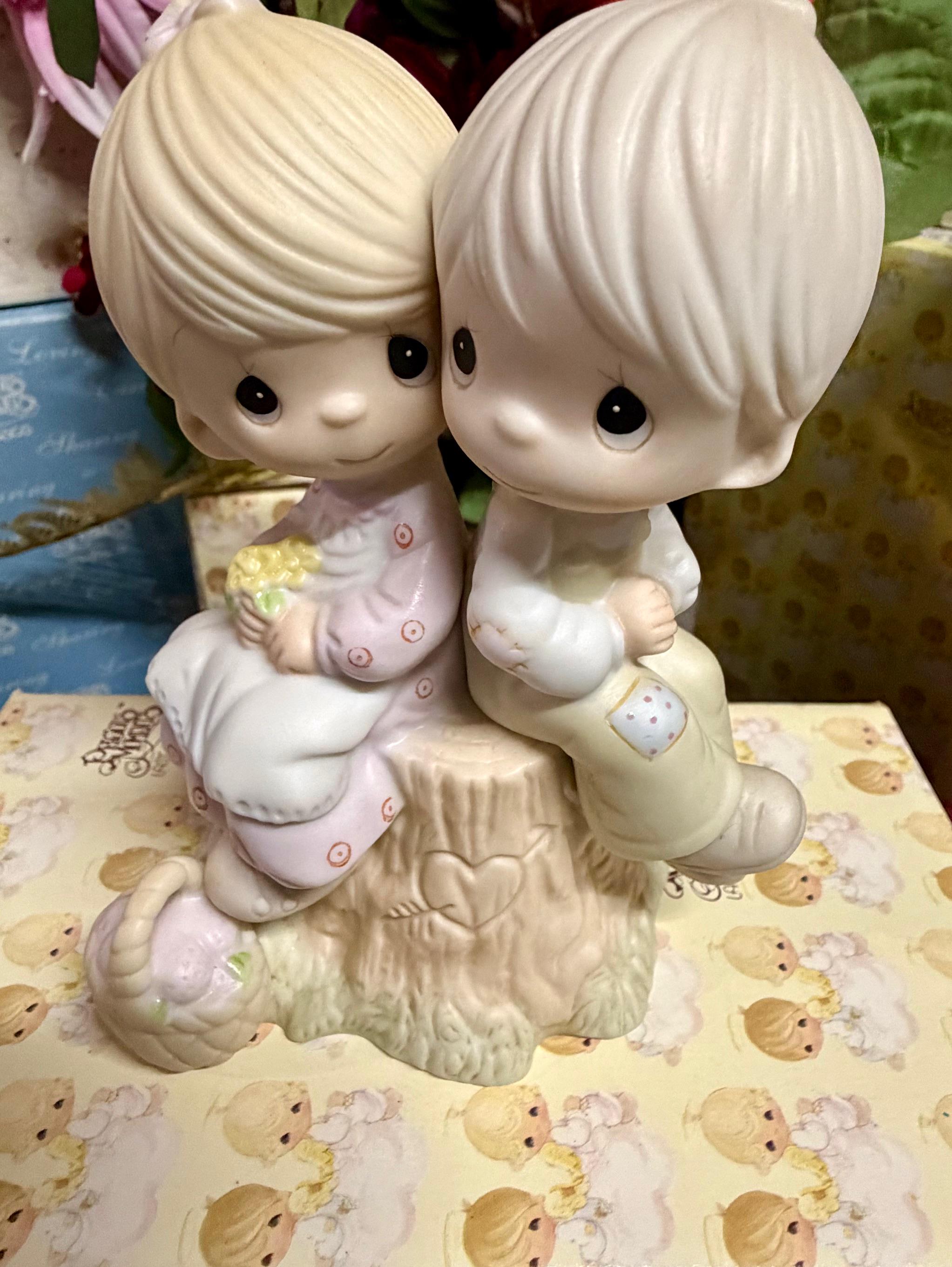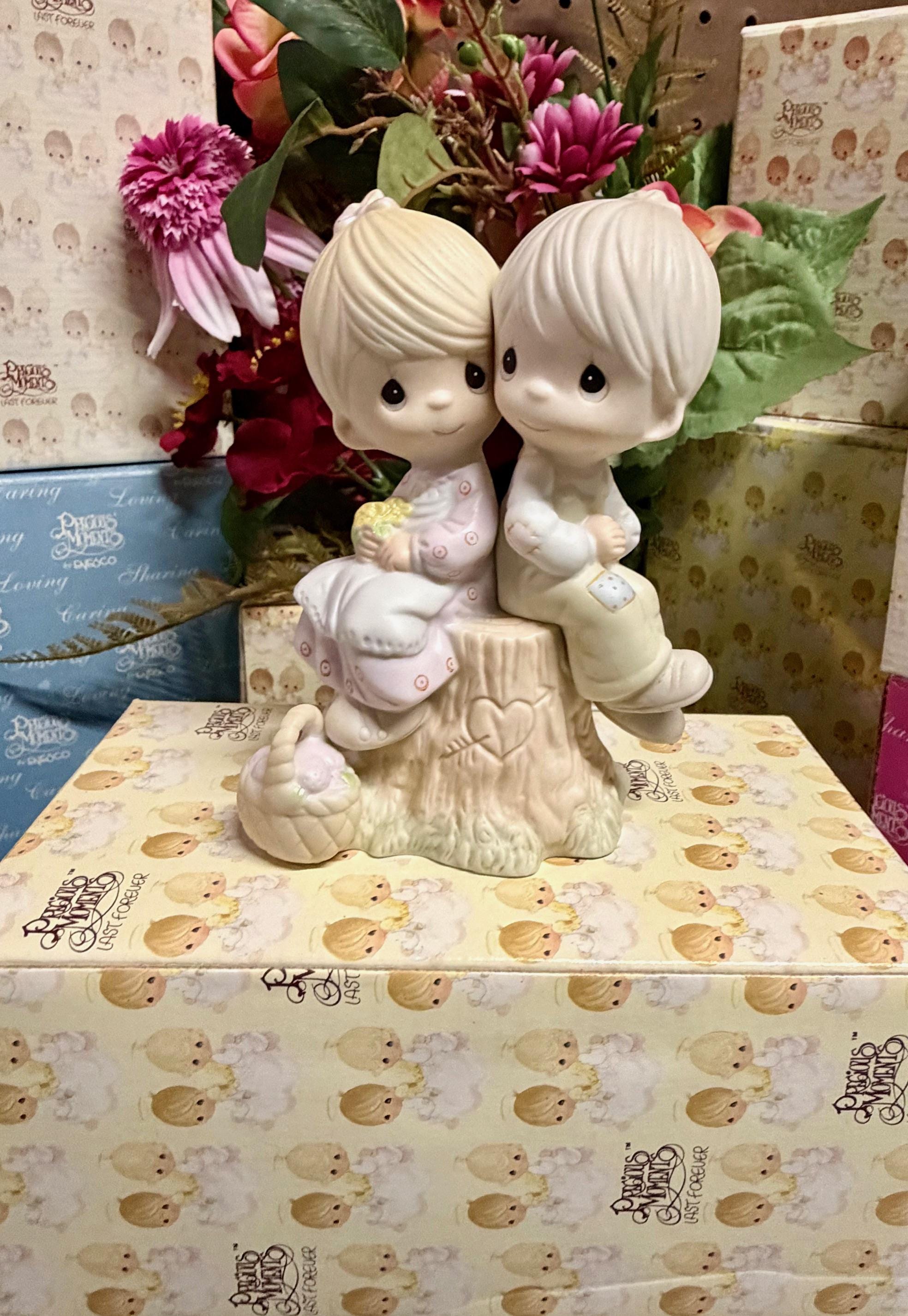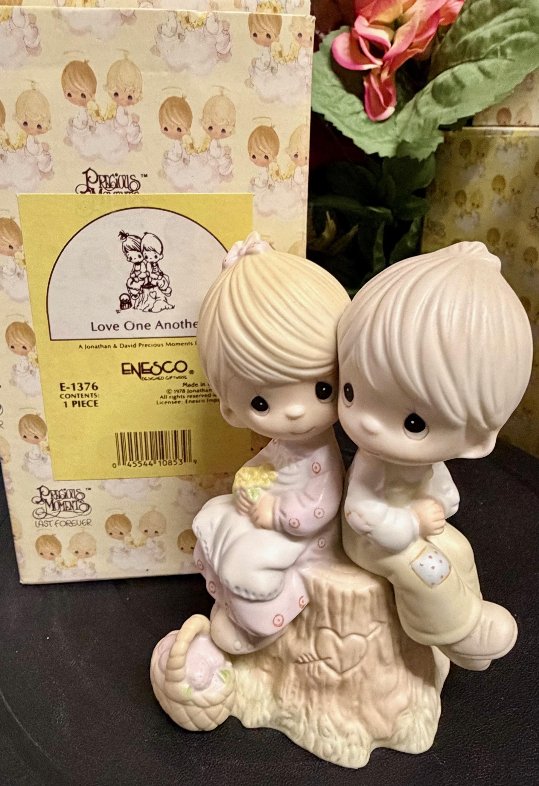 Celebrate one of the most iconic Precious Moments designs with this classic figurine featuring a boy and girl sitting together on a tree stump carved with a heart. As part of the Original 21 figurines introduced in the late 1970s, Love One Another remains one of the most cherished and recognizable pieces in the entire collection. Expertly crafted in bisque porcelain and standing approximately 5 inches tall, this timeless figurine is perfect for collectors, anniversaries, weddings, or anyone who appreciates the gentle message of love and togetherness.