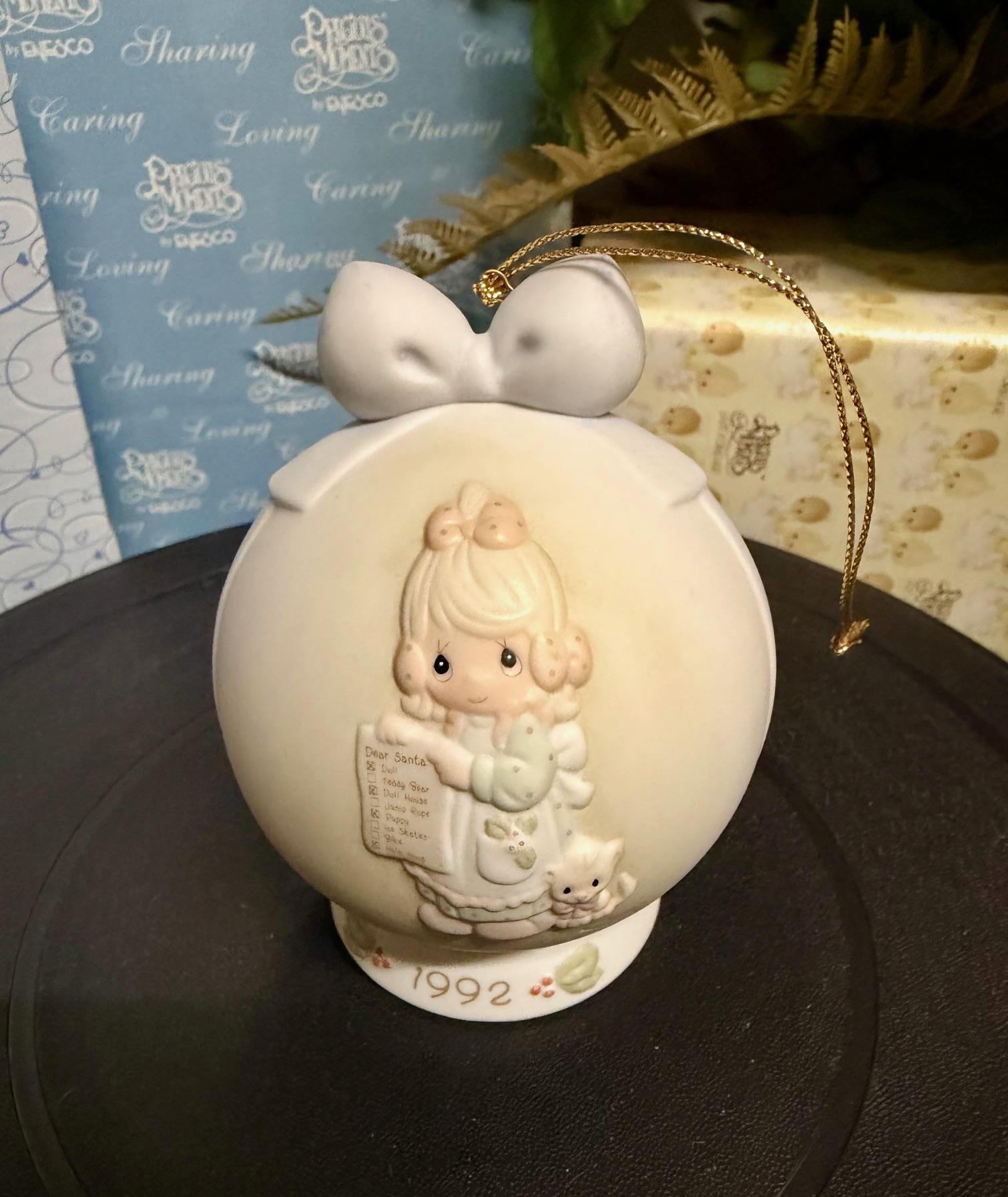Celebrate the sweetness of the season with this charming 1992 Precious Moments ornament featuring a child holding a list and a tiny animal friend by their side. Crafted in bisque porcelain with soft pastel details, this Special Issue ornament captures the gentle message of love that Precious Moments is known for. The sculpted base is dated 1992, making it a meaningful keepsake for collectors or anyone celebrating a special year.