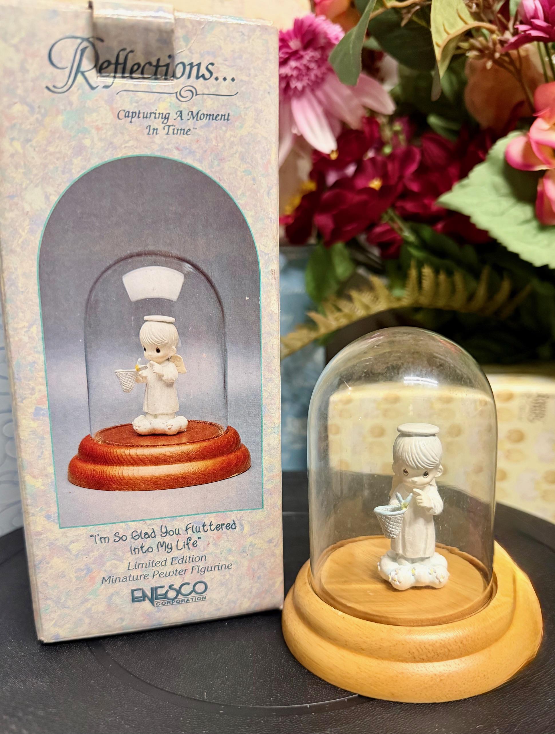 This charming Enesco Reflections collectible captures a tender moment in miniature. A sweet pewter angel holds a basket with a tiny butterfly, preserved under a glass dome on a wooden base. Part of the Reflections… Capturing a Moment in Time series, this limited‑edition piece is a heartfelt way to celebrate someone who has brought light, joy, or inspiration into your life. Perfect for collectors, gift‑givers, or anyone who loves meaningful keepsakes.