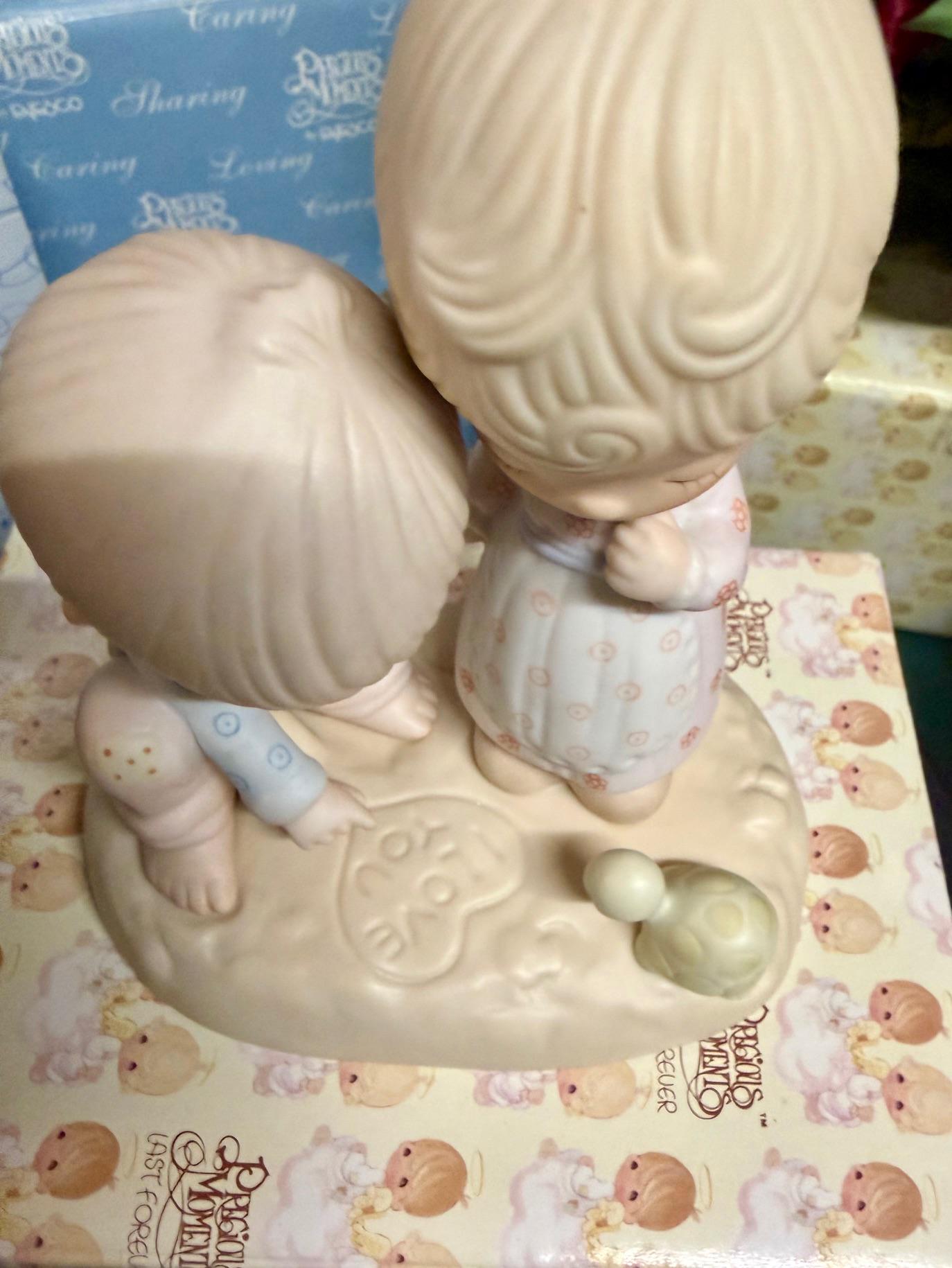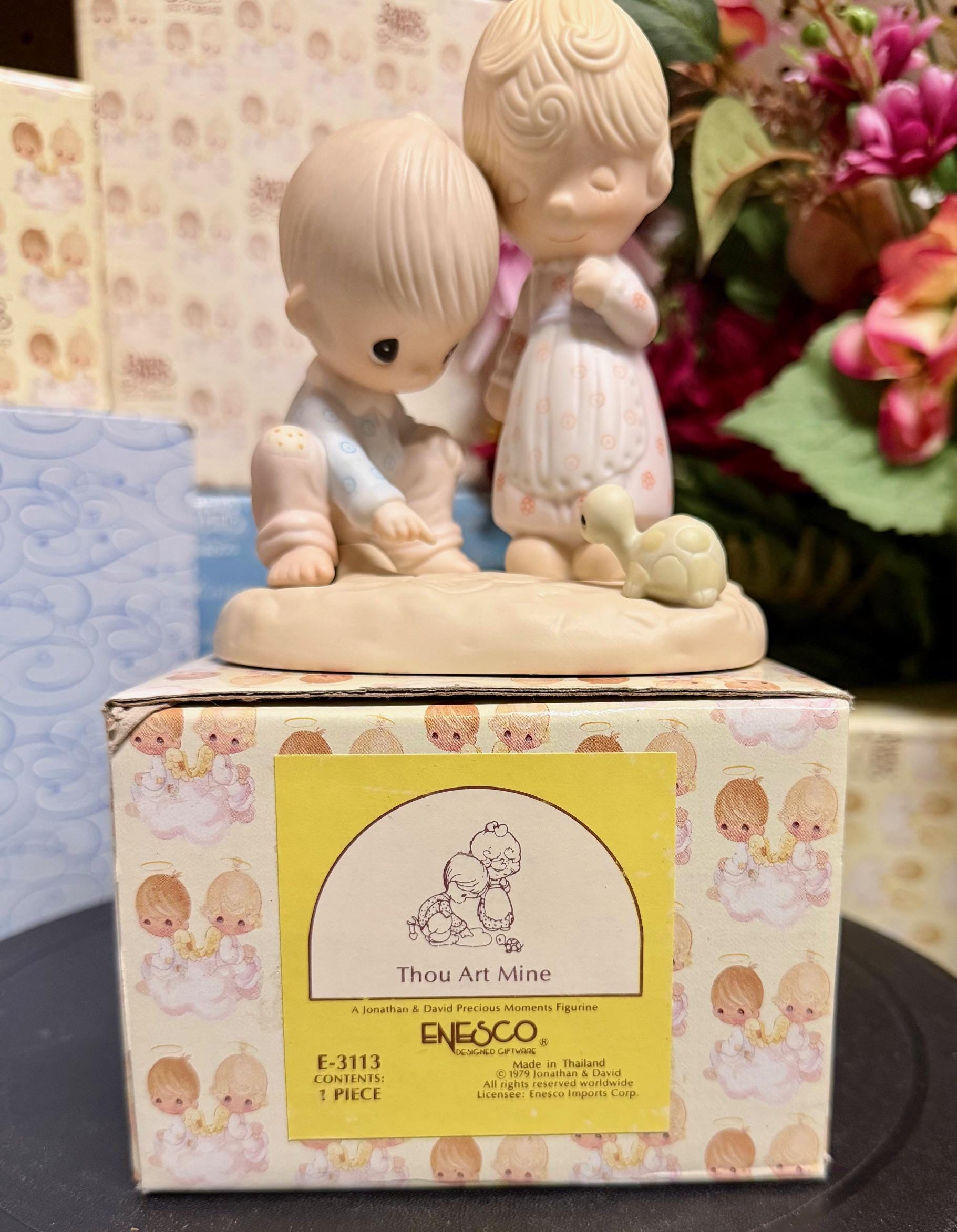 Celebrate the sweetness of early Precious Moments artistry with this vintage 1979 figurine featuring two children greeting a tiny turtle. Designed by Jonathan & David and crafted in fine bisque porcelain, Thou Art Mine captures the gentle innocence and heartfelt charm that made Precious Moments beloved around the world. With its soft pastel details and nostalgic styling, this piece is a lovely addition to any collection.