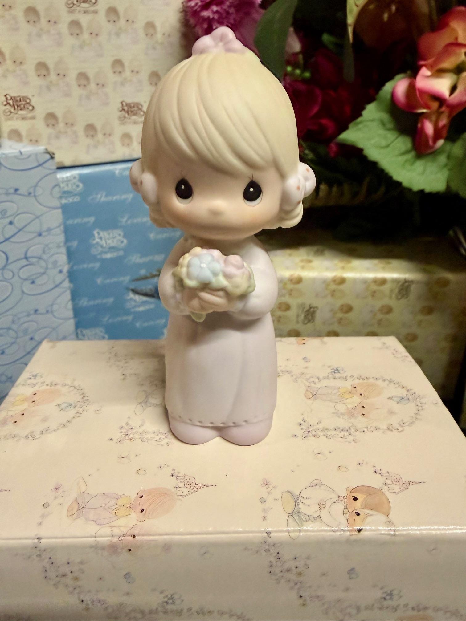 This sweet Precious Moments bridesmaid brings a soft, sentimental touch to any wedding‑themed display. Dressed in a flowing gown and holding a pastel bouquet, she captures the gentle beauty and innocence that make Precious Moments so beloved. Whether added to a wedding collection, gifted to a bridesmaid, or cherished as a nostalgic keepsake, she brings warmth and charm to any space.