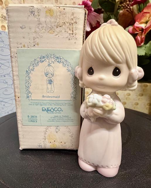 A sweet and timeless addition to the Precious Moments Wedding Party collection, this vintage 1981 bridesmaid figurine features a gentle young girl holding a pastel bouquet, dressed in classic bridal‑party elegance. Her soft expression and delicate detailing capture the innocence and joy of celebrating love. Perfect for collectors, bridal displays, or anyone who cherishes the early Precious Moments era.